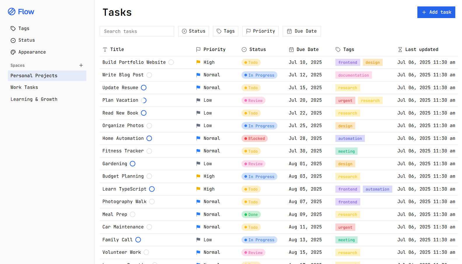 Flow is a simple, secure task manager app that runs entirely in your browser—no account needed. With a modern, customizable UI, all your data stays private on your device, stored locally using a PostgreSQL database via Pglite and IndexedDB. Enjoy effortless task management with complete privacy and convenience.